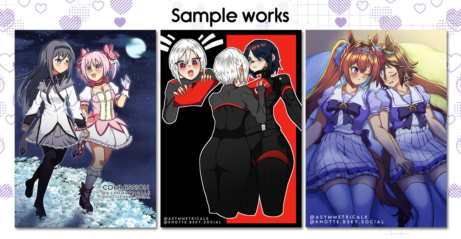 I specialize in drawing yuri and female characters. Commissions of subjects that I'm not comfortable with or unsuitable to draw may be turned down if requested.